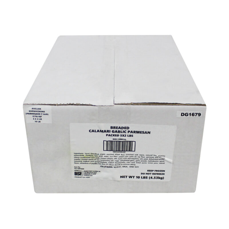 Sea Best Garlic Parmesan Breaded Calamari Rings are produced from wild caught squid harvested from the waters of Peru. Squid has a mild flavor and a firm texture, making it ideal for any type of breaded coating. Each calamari ring is lightly coated in a garlic Parmesan seasoned Panko bread crumb. These calamari rings cook up crispy on the outside while remaining tender on the inside and have a delicious, savory flavor. The breaded calamari rings are individually quick frozen and poly bagged for optimal freshness and convenience.