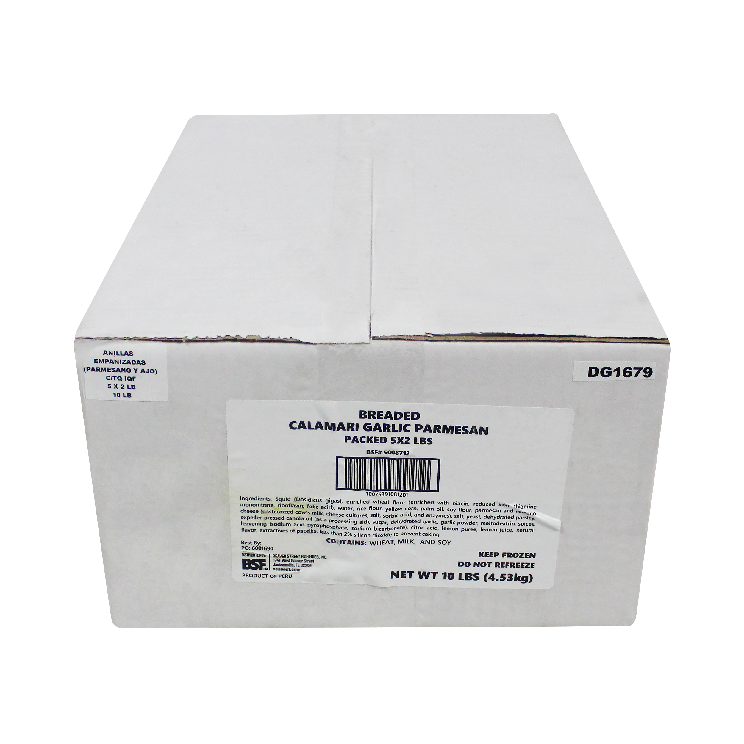 INGREDIENT STATEMENT Squid (Dosidicus gigas), enriched wheat flour (enriched with niacin, reduced iron, thiamine mononitrate, riboflavin, folic acid), water, rice flour, yellow corn flour, palm oil, soy flour, parmesan and romano cheese (pasteurized cow's milk, cheese cultures, salt, sorbic acid, and enzymes), salt, yeast, dehydrated parsley ,expeller pressed canola oil (as a processing aid), sugar, dehydrated garlic, garlic powder, maltodextrin, spices, leavening (sodium acid pyrophosphate, sodium bicarbonate), citric acid, lemon puree, lemon juice, natural flavor, extractives of paprika, less than 2% silicon dioxide to prevent caking.