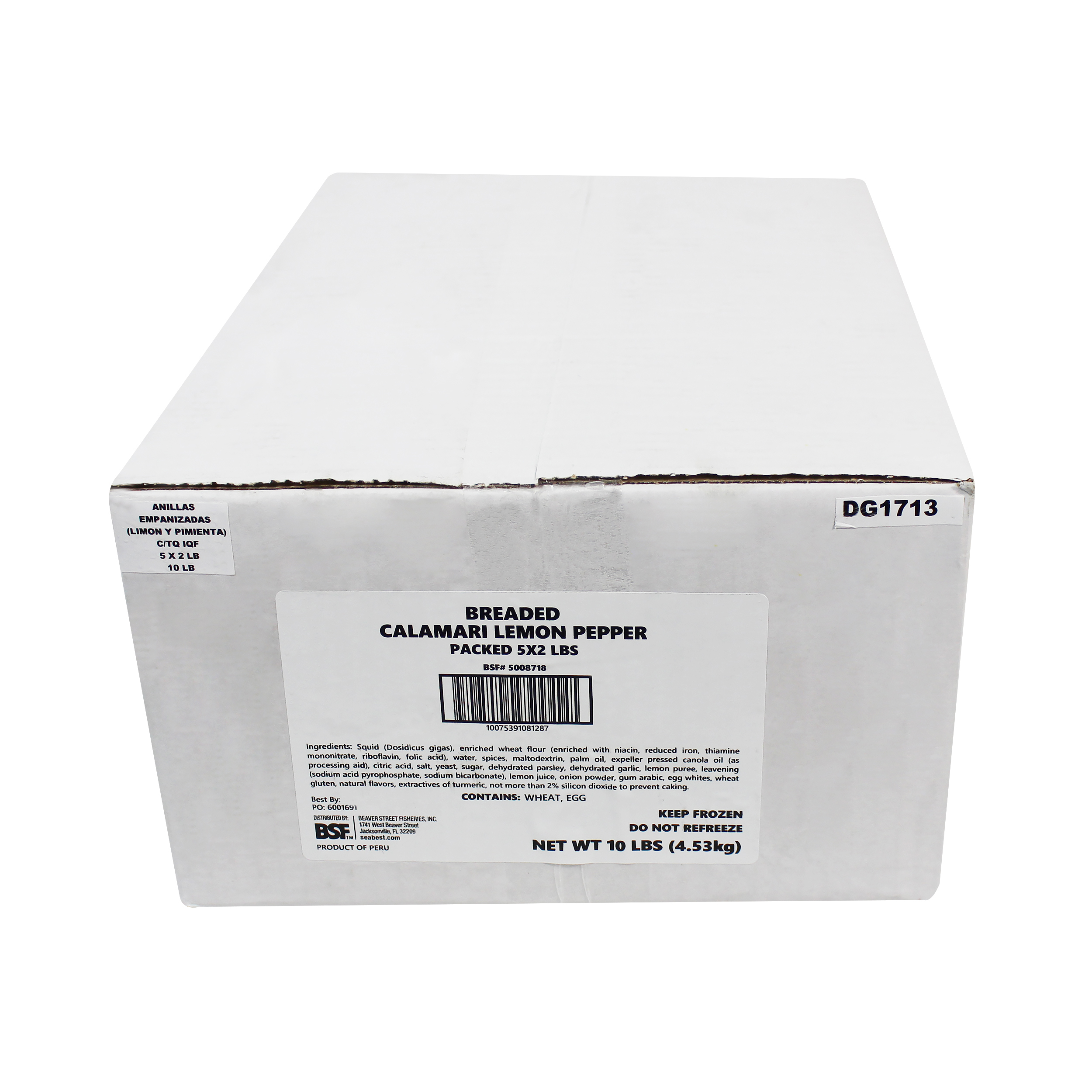 INGREDIENT STATEMENT Squid (Dosidicus gigas), enriched wheat flour (enriched with niacin, reduced iron, thiamine mononitrate, riboflavin, folic acid), water, spices, maltodextrin, palm oil, expeller pressed canola oil (as a processing aid), citric acid, salt, yeast, sugar, dehydrated parsley, dehydrated garlic, lemon puree, leavening (sodium acid pyrophosphate, sodium bicarbonate), lemon juice, onion powder, gum arabic, egg whites, wheat gluten, natural flavors, extractives of turmeric, not more than 2% silicon dioxide to prevent caking.