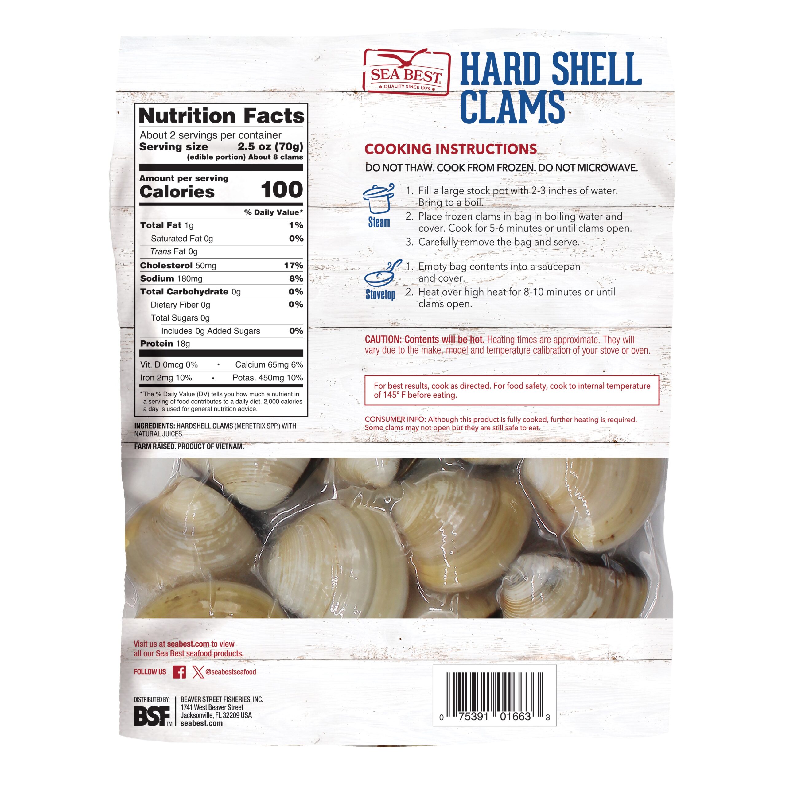 Sea Best all natural hardshell clams are farm-raised, fully cleaned, cooked in shell, and ready to heat and eat. These clams are known for their fresh, clean flavor and are ideal for pasta or steamers. Each clam is individually quick frozen and vacuum packaged in their own natural juices for optimal flavor, freshness, and convenience.
