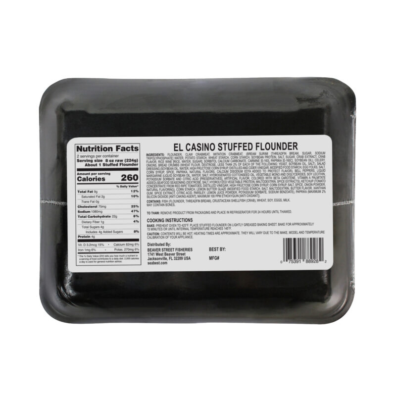Sea Best Deluxe Seafood Stuffed Flounder is expertly crafted with responsibly sourced, wild caught flounder and our deluxe seafood stuffing. Skinless, boneless flounder fillets are generously filled with a flavorful blend of wild caught blue swimming crab claw meat, imitation crabmeat, frozen diced vegetables, bread crumbs, and a unique mix of seasonings. The result is a delicious mildly sweet, crab-forward flavor that perfectly complements the lean, flaky texture of the flounder. Ready to cook and requiring no preparation, this seafood option offers a quick, restaurant-quality meal at home. Deluxe Seafood Stuffed Flounder are individually quick frozen and packed in an overwrapped retail ready labelled tray for optimal freshness and convenience.