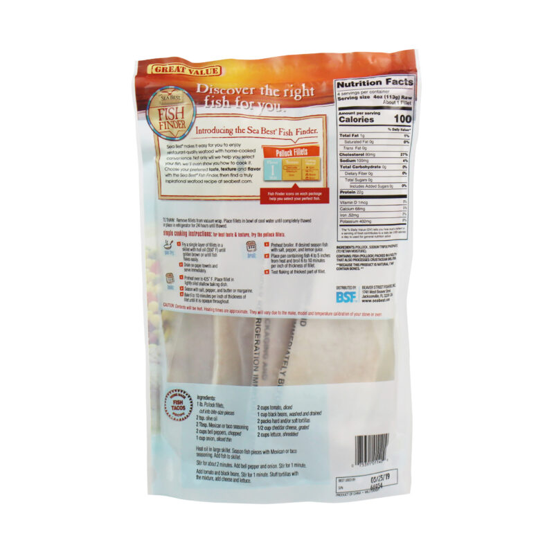 Sea Best wild caught pollock fillets are popular for their mild flavor and a medium, flaky texture. The neutral taste of pollock allows accompanying flavors to infuse the flaky meat, and it adapts to the seasoning and sauces it’s cooked in. Each fillet is individually vacuum packaged for optimal freshness and convenience.