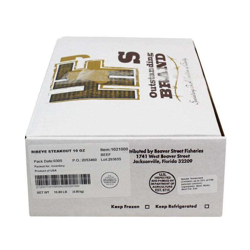 HF's Outstanding Boneless Steak Out Ribeye is cut from no roll beef for a delicious tasting value beef steak option. This boneless steak is rich, tender, juicy and full-flavored with generous marbling throughout. Each steak is enhanced with 17% water, beef fat and salt injection for added flavor and individually vacuum packaged for optimal freshness and convenience.