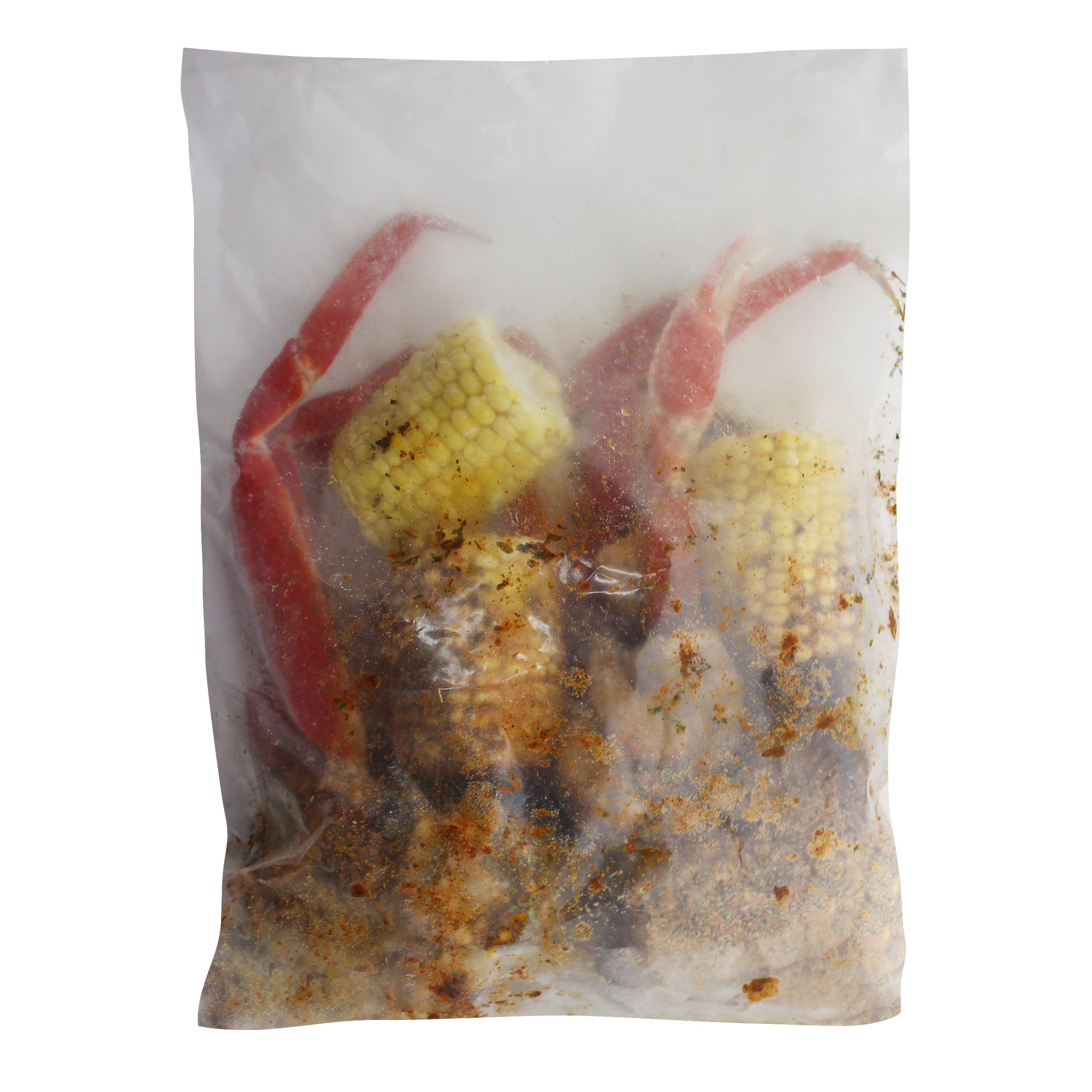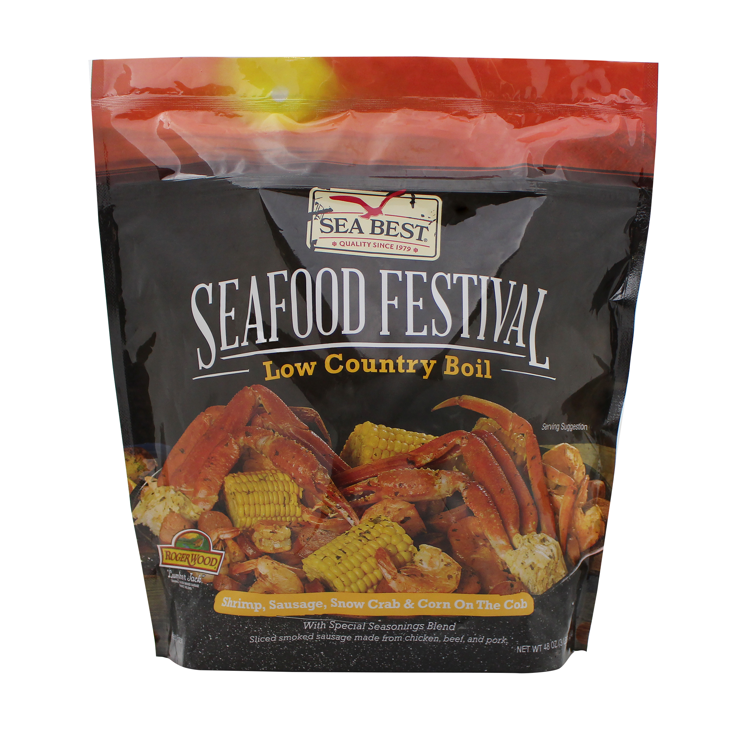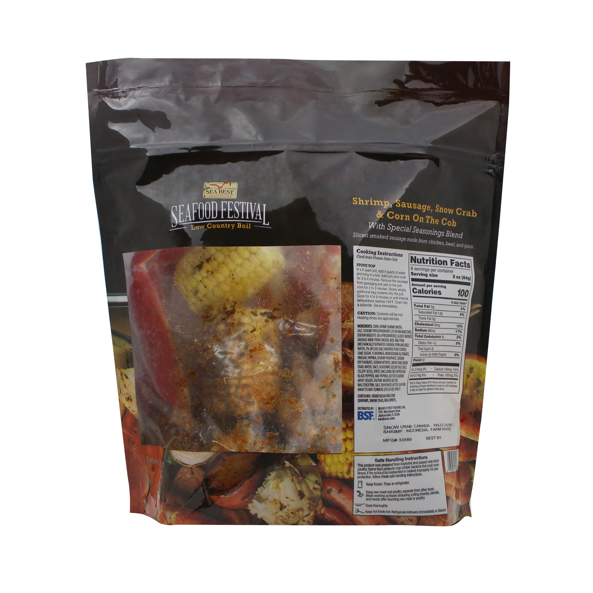 Sea Best Seafood Festival Low Country Boil makes it easy to enjoy a traditional coastal favorite with all the ingredients conveniently packed in one bag. This ready-to-cook mix features snow crab, shrimp, corn on the cob, and Roger Wood Lumber Jack sliced smoked sausage made from chicken, beef, and pork, bringing together the authentic flavors of a low country boil. Perfect for family gatherings, entertaining, or restaurant service, this all-in-one pot seafood boil eliminates prep time and ensures a simple, authentic seafood boil every time. The seafood and corn are pre-seasoned and individually quick frozen to preserve freshness, while the pre-sliced smoked sausage is vacuum sealed to maintain peak quality. All ingredients are further protected in a durable poly-bag and placed in a retail-ready package designed for both display and convenient storage.