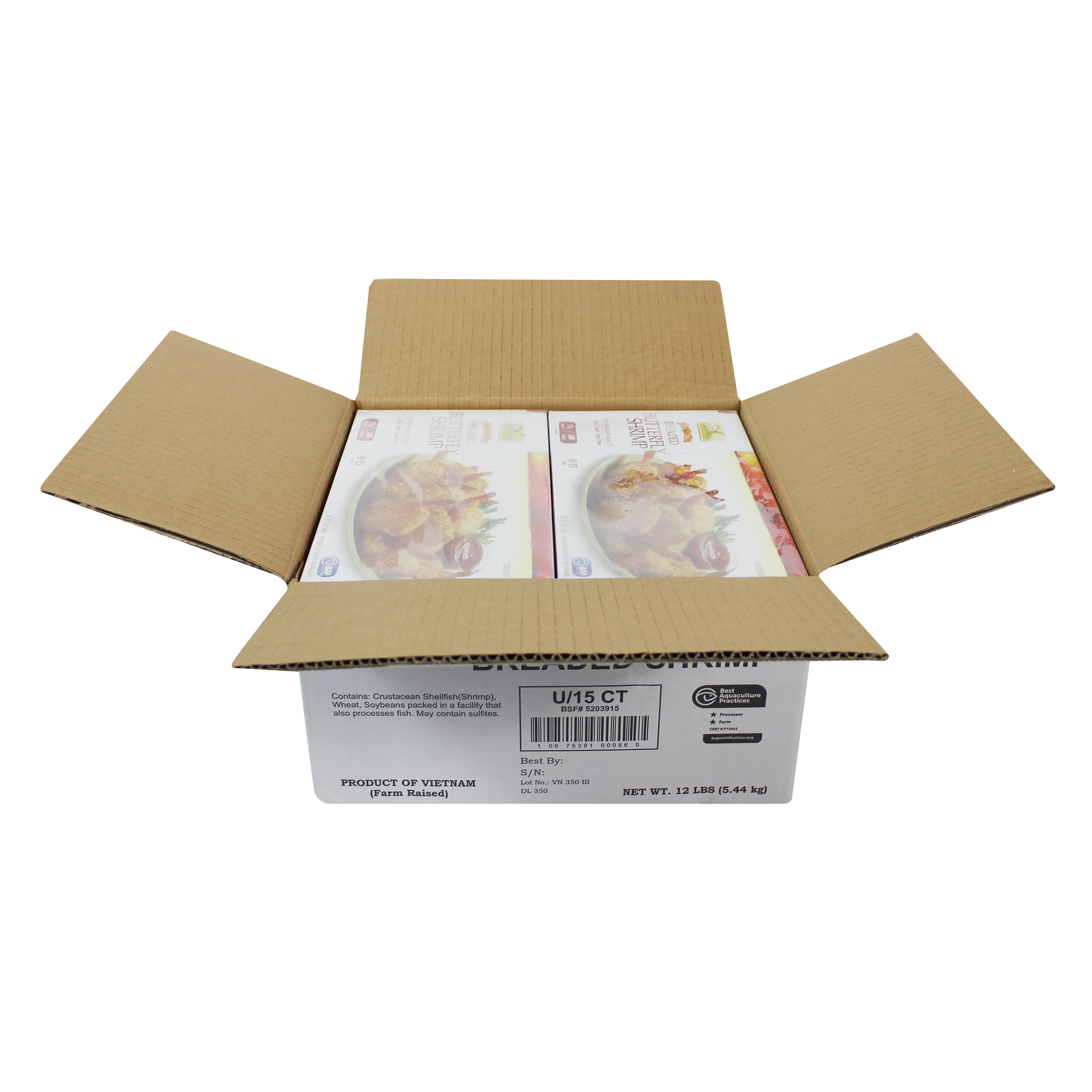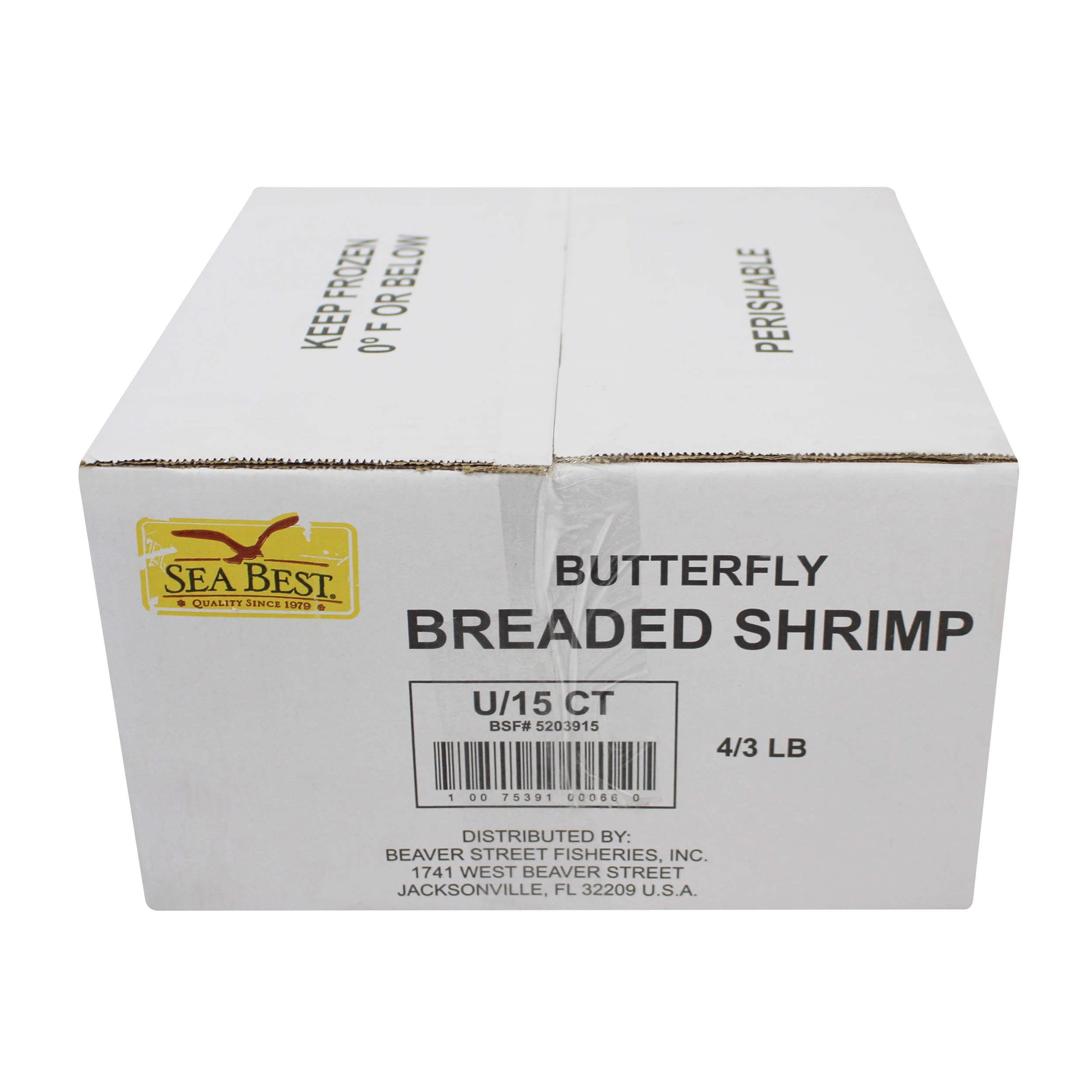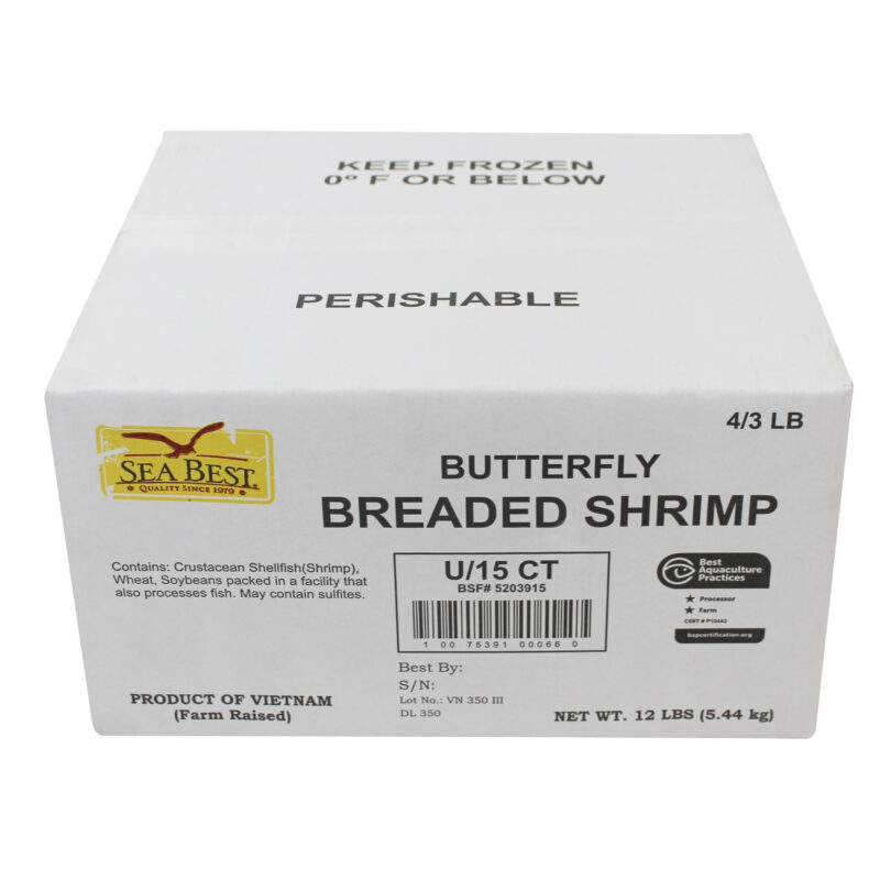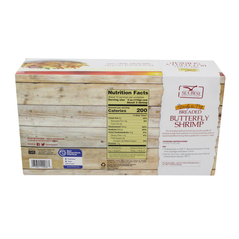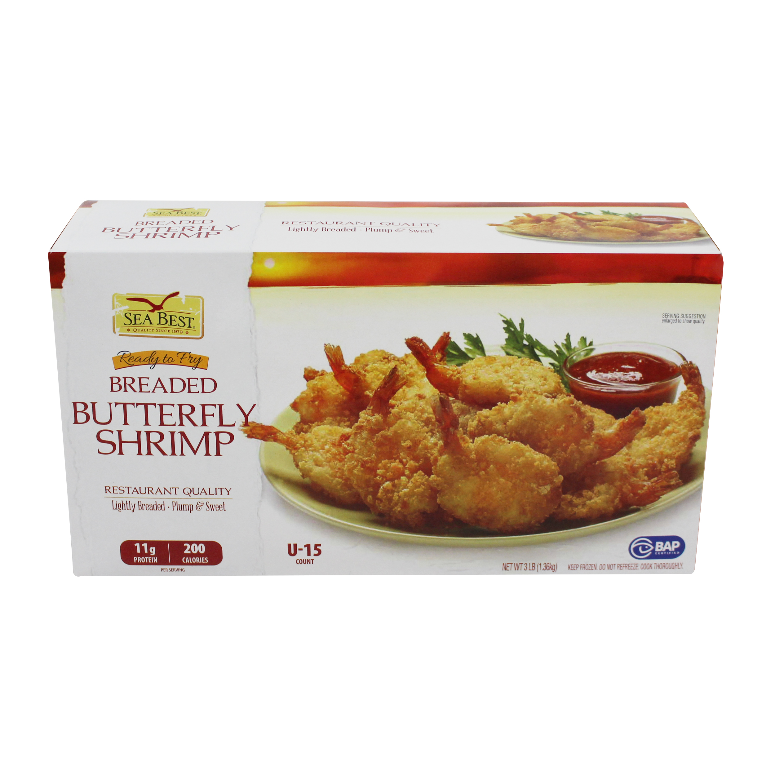 Sea Best Breaded Butterfly Shrimp are farm-raised and processed in BAP Certified plants. Plump and sweet butterflied shrimp are hand-breaded in a light breading and deliver a restaurant-quality shrimp that is crunchy to the bite with a tender texture. Each butterflied shrimp is individually quick frozen and carefully packaged for optimal freshness and convenience.