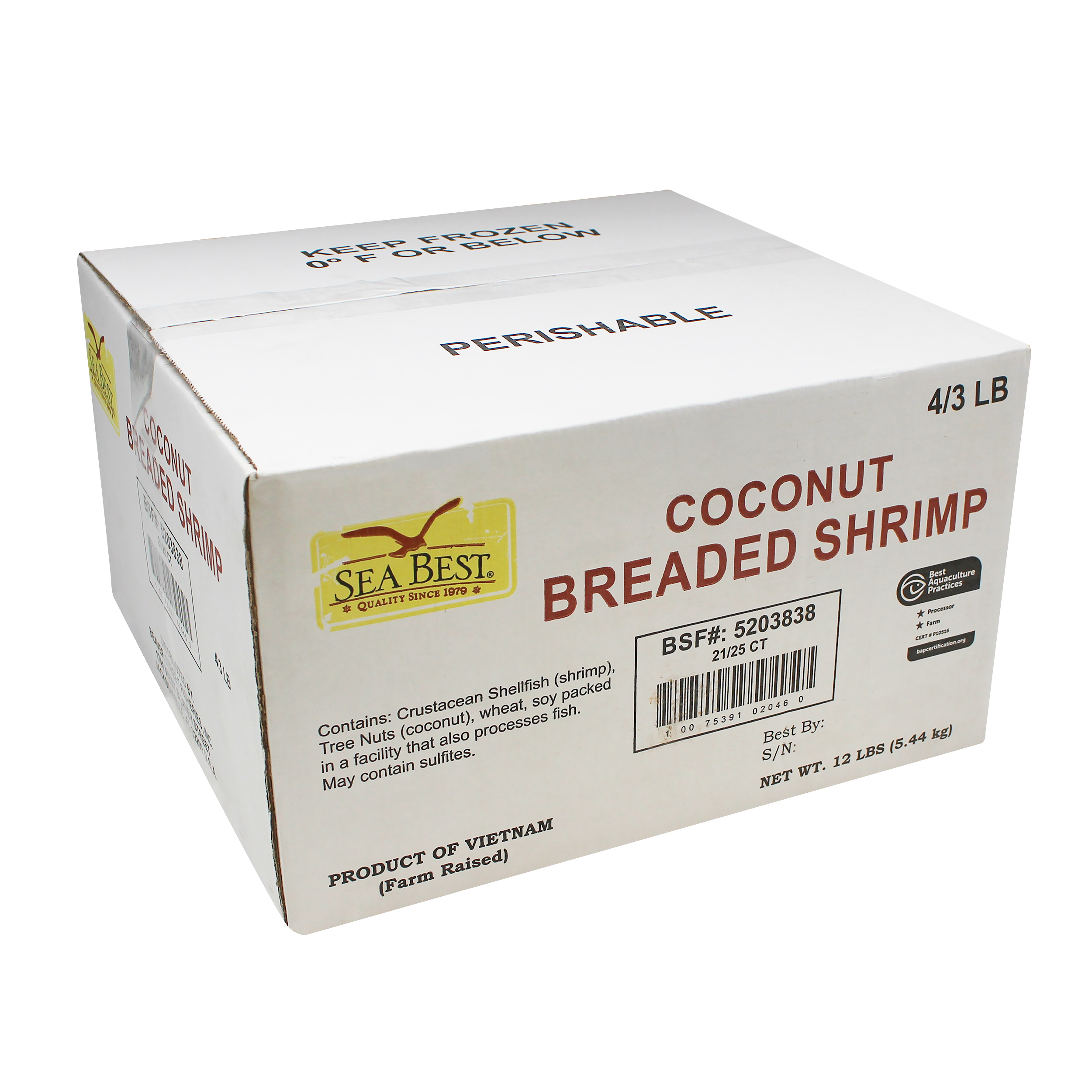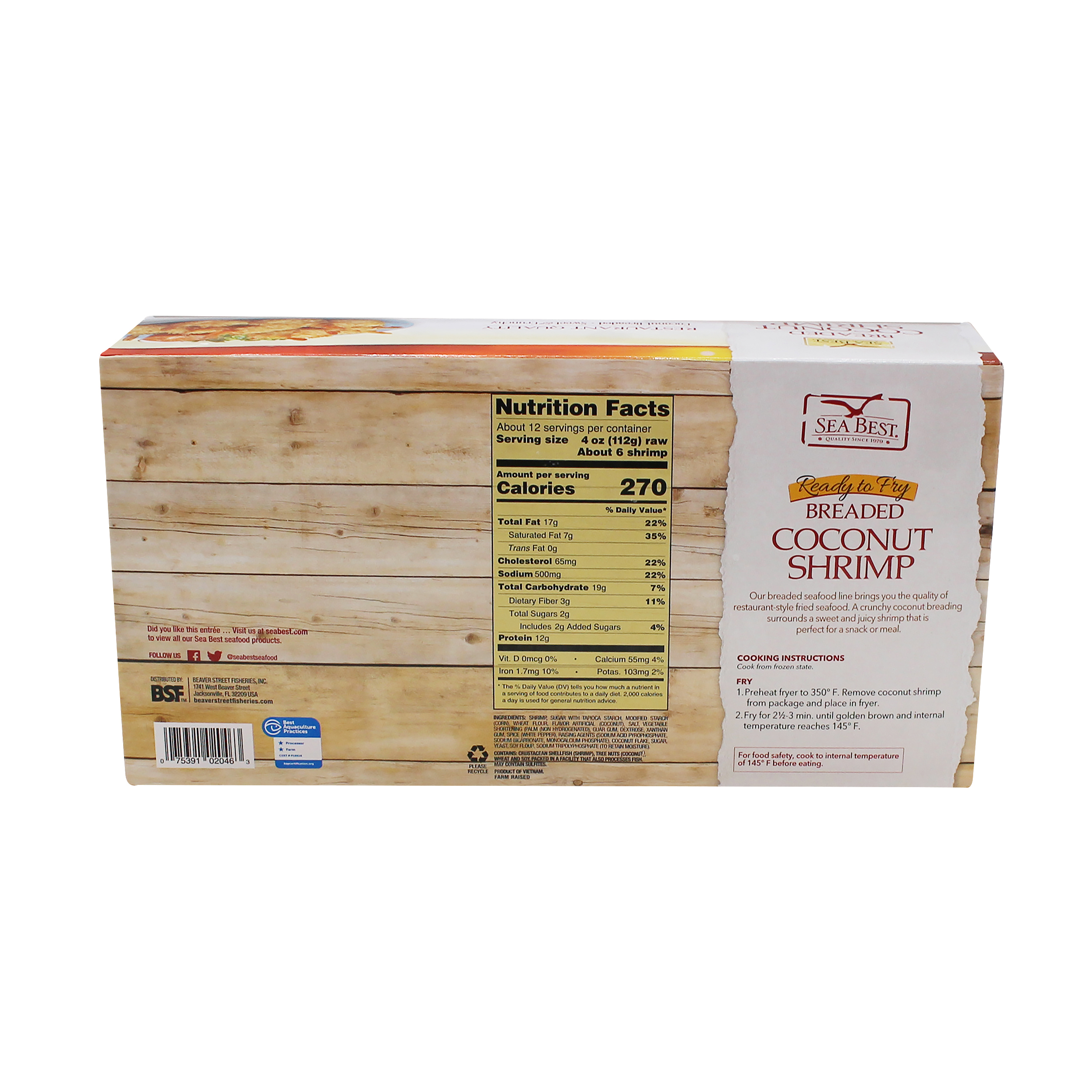 Sea Best Breaded Butterfly Coconut Shrimp are farm-raised and processed in a BAP certified plant. These lightly breaded, plump and sweet butterflied shrimp fry to a crisp, golden brown. Our breaded butterfly shrimp are ready-to-fry, delivering an easy to prepare restaurant-quality shrimp. Each breaded shrimp is individually quick frozen and poly bagged for optimal freshness and convenience.