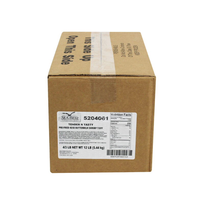 Sea Best Buttermilk Breaded Shrimp have a mild flavor and a medium, tender texture. The rich buttermilk batter cooks up golden and crispy, and nicely complements the subtle flavored shrimp. These breaded shrimp are pre-fried for quick preparation. Each breaded shrimp is individually quick frozen and poly bagged for optimal freshness and convenience.