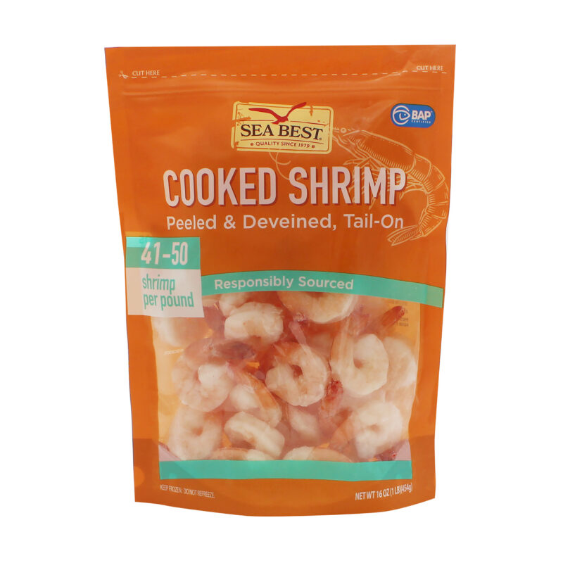 Sea Best cooked, P&D, tail-on shrimp are farm-raised and processed in a BAP Certified plant. These fully cooked shrimp are peeled and deveined and ready to enjoy. The mild sweet flavor and tender bite of these shrimp are ideal as is or incorporated into your favorite salad, wrap, or dip. Each shrimp is individually quick frozen and packaged in a resealable bag for optimal freshness and convenience.
