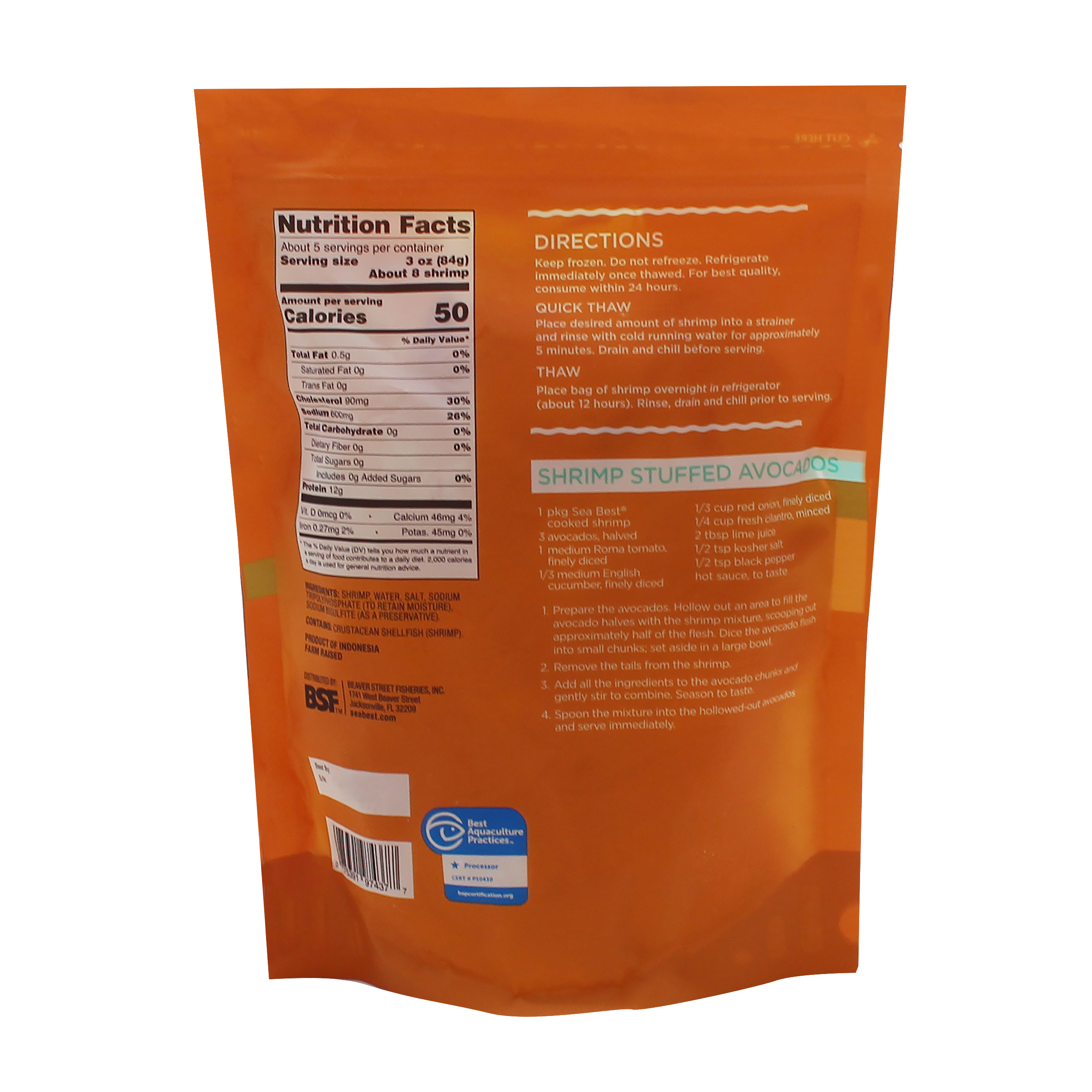 Sea Best cooked, P&D, tail-on shrimp are farm-raised and processed in a BAP Certified plant. These fully cooked shrimp are peeled and deveined and ready to enjoy. The mild sweet flavor and tender bite of these shrimp are ideal as is or incorporated into your favorite salad, wrap, or dip. Each shrimp is individually quick frozen and packaged in a resealable bag for optimal freshness and convenience.
