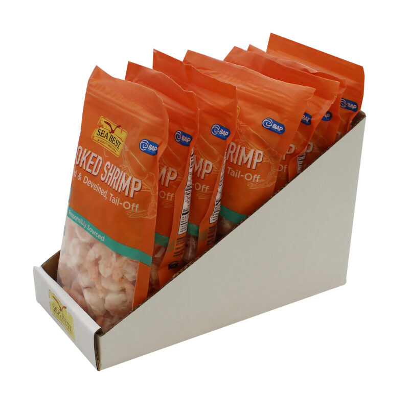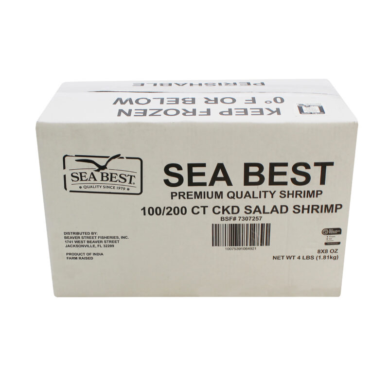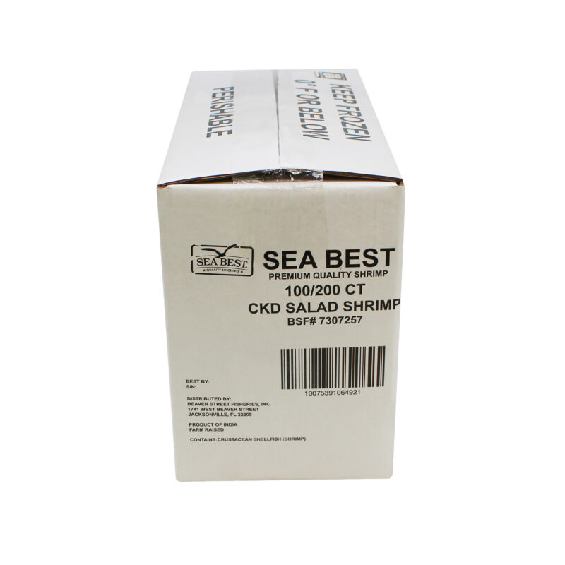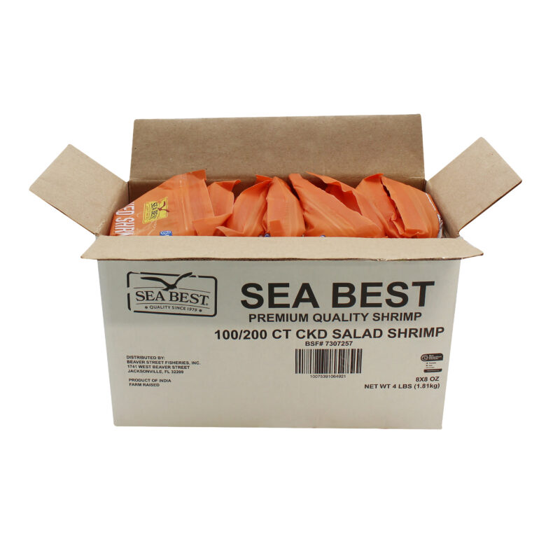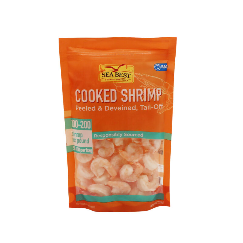 Sea Best 100-200 cooked, peeled and deveined, tail-off salad shrimp are farm-raised and processed in a BAP Certified plant. These fully cooked shrimp are peeled and deveined and ready to enjoy. With a sweet flavor and firm texture, these shrimp are delicious tossed in a sauce or added to a variety of recipes for a healthy, delicious protein option. The shrimp are individually quick frozen and packaged in a resealable bag for for optimal freshness.