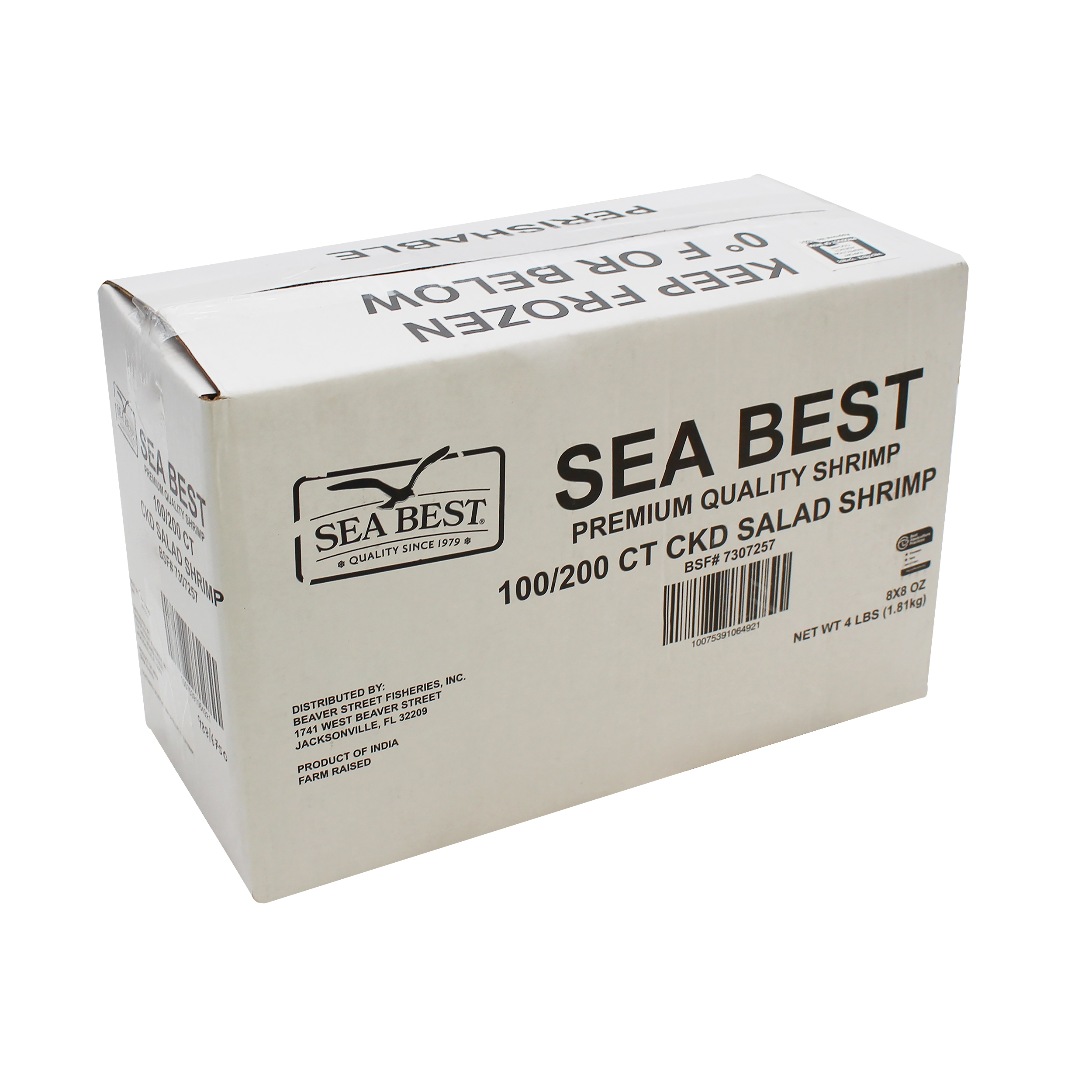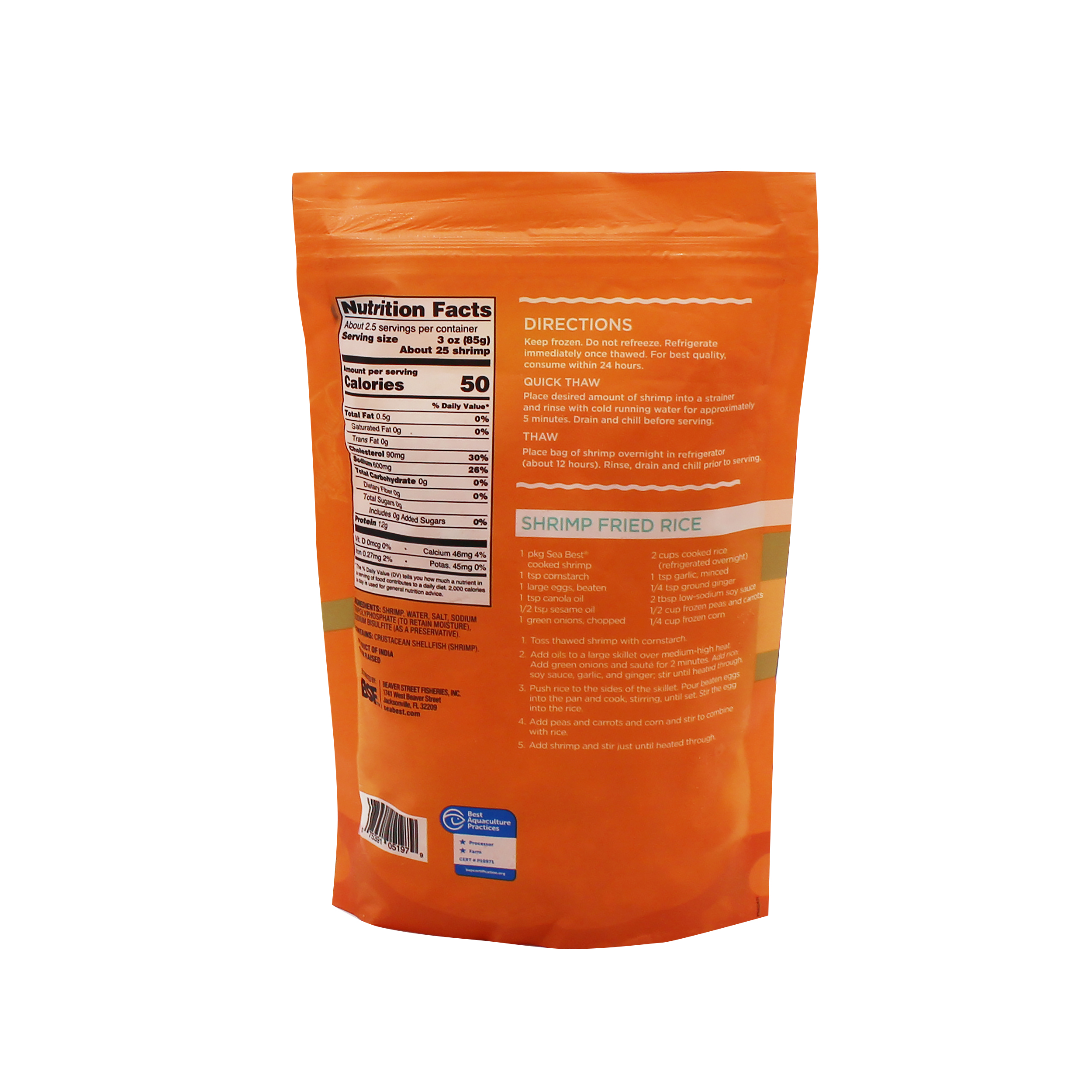 Sea Best 100-200 cooked, peeled and deveined, tail-off salad shrimp are farm-raised and processed in a BAP Certified plant. These fully cooked shrimp are peeled and deveined and ready to enjoy. With a sweet flavor and firm texture, these shrimp are delicious tossed in a sauce or added to a variety of recipes for a healthy, delicious protein option. The shrimp are individually quick frozen and packaged in a resealable bag for for optimal freshness.