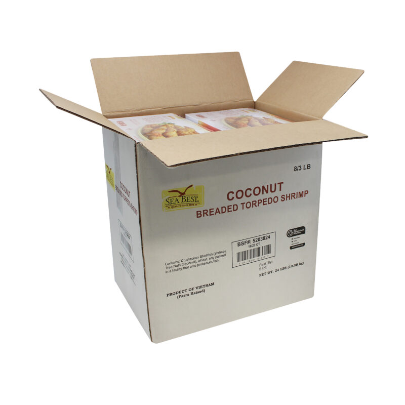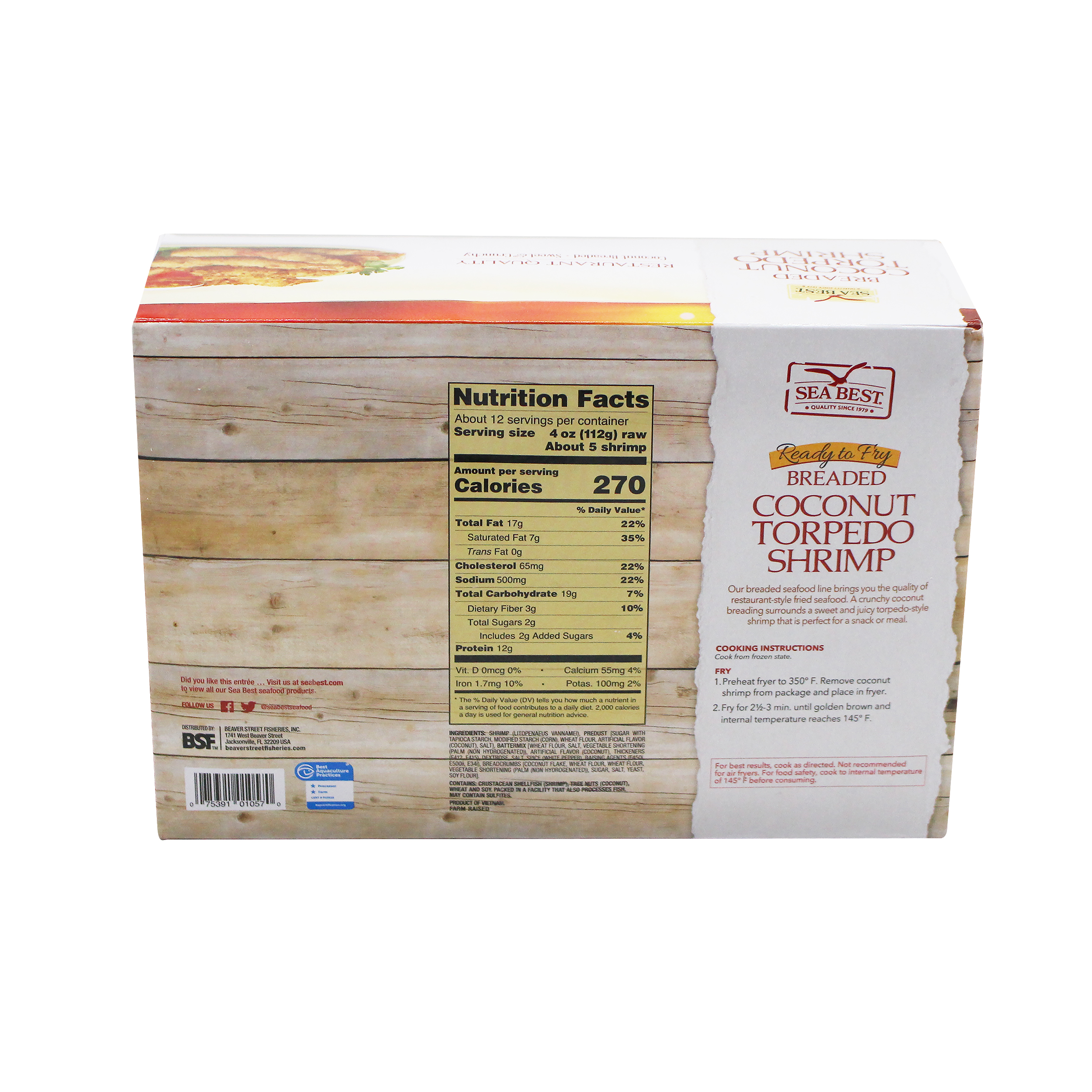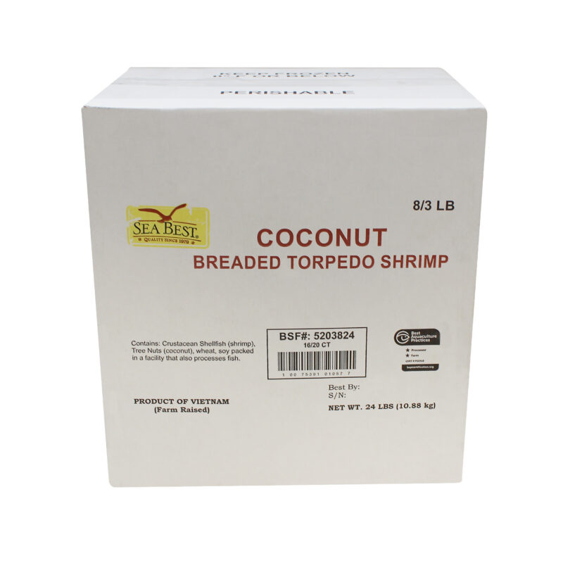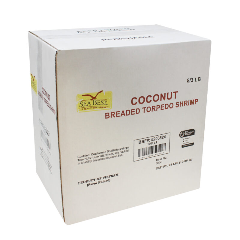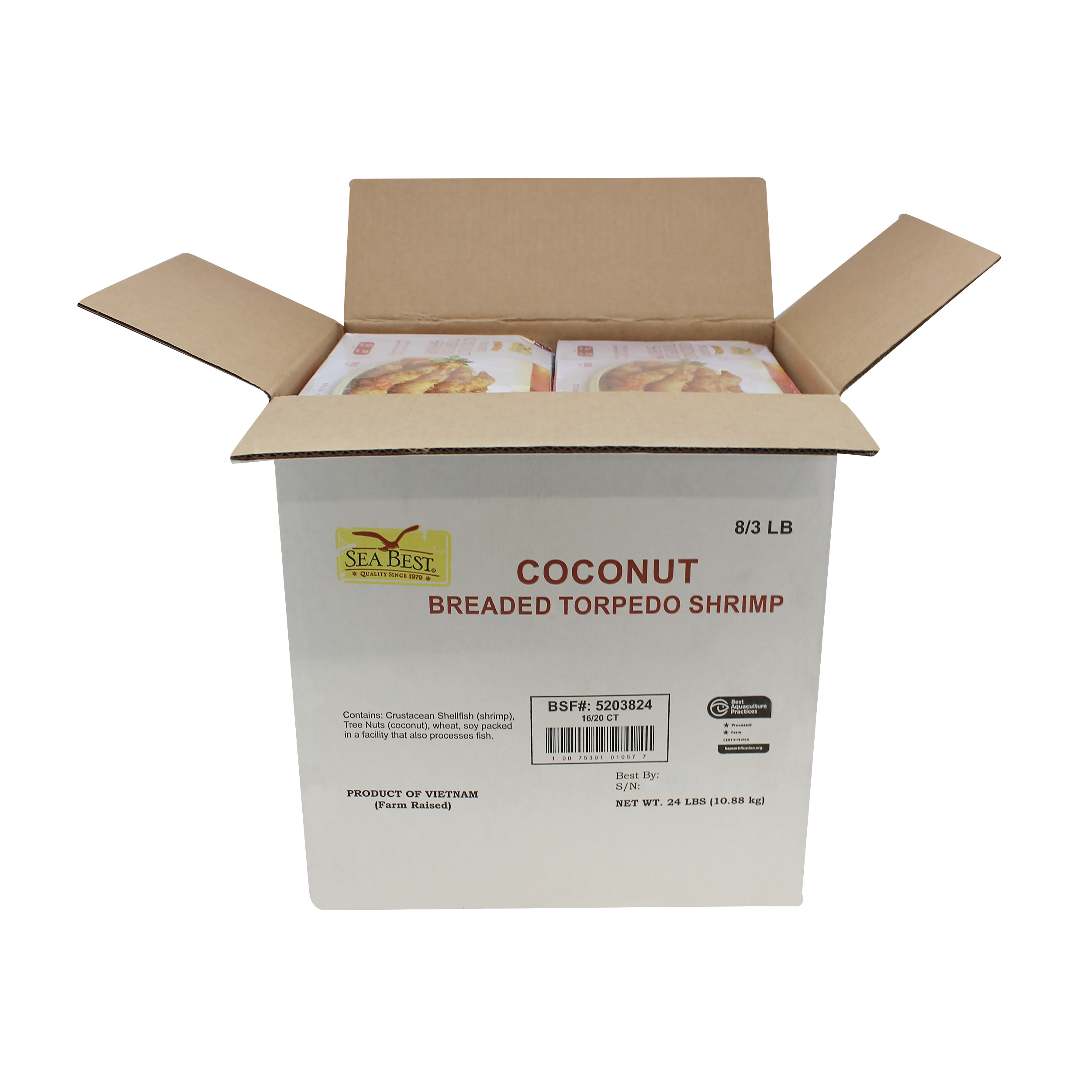 Sea Best Breaded Coconut Torpedo Shrimp are farm-raised and processed in a BAP Certified Plant. These fun and unique shaped shrimp are hand breaded in a crunchy coconut breading, surrounding a sweet and juicy torpedo-style shrimp. Each shrimp is individually quick frozen and package for optimal freshness and convenience.