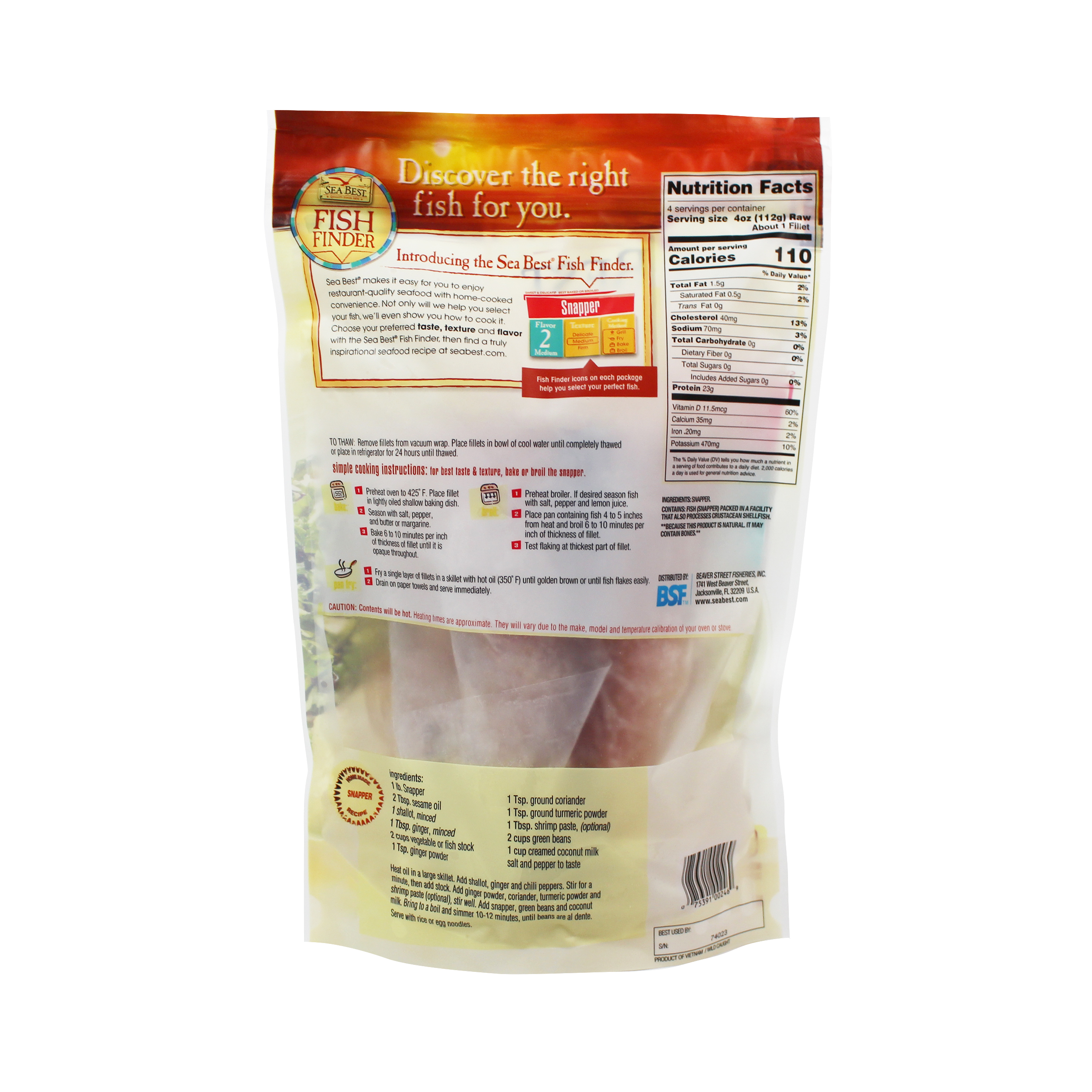 Sea Best Snapper skinless, boneless fillets are wild caught and all natural. Snapper is sweetly mild, lean and moist with a medium texture and responds well to just about any cooking method. Each fillet is individually quick frozen, vacuum sealed, and packaged in a resealable bag for optimal freshness and convenience.
