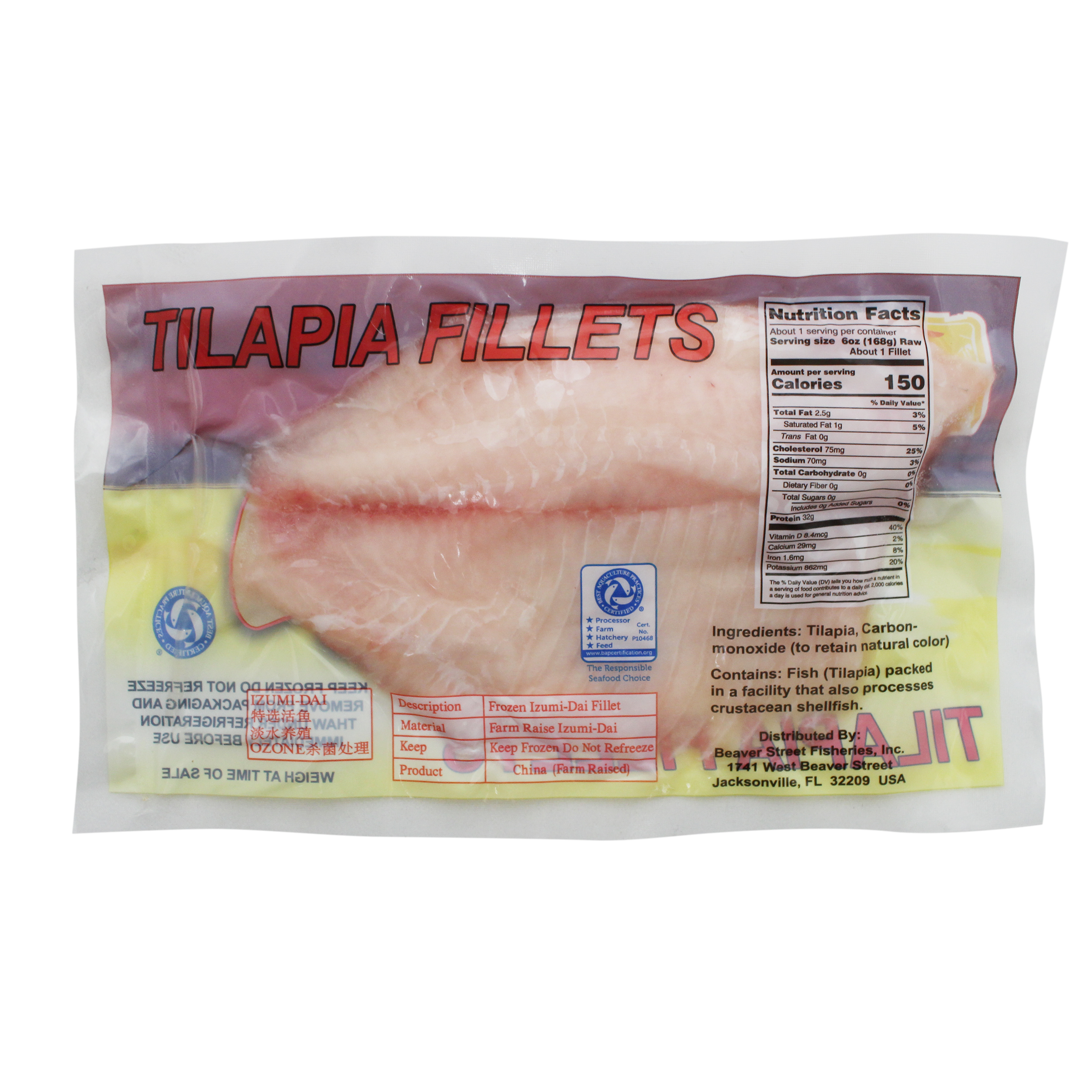 Our Sea Best Tilapia fillets are farm-raised, processed in a BAP Certified plant and CO-enhanced to preserve their natural color. Tilapia is a mild, lean fish that is popular for its palate-friendly flavor. The neutral taste of tilapia allows accompanying flavors to infuse the flaky meat, and it adapts to the seasoning and sauces it’s cooked in. Tilapia is also low in fat and calories and provides an excellent source of protein. Each Tilapia fillet is individually vacuum packed for optimal freshness and convenience.
