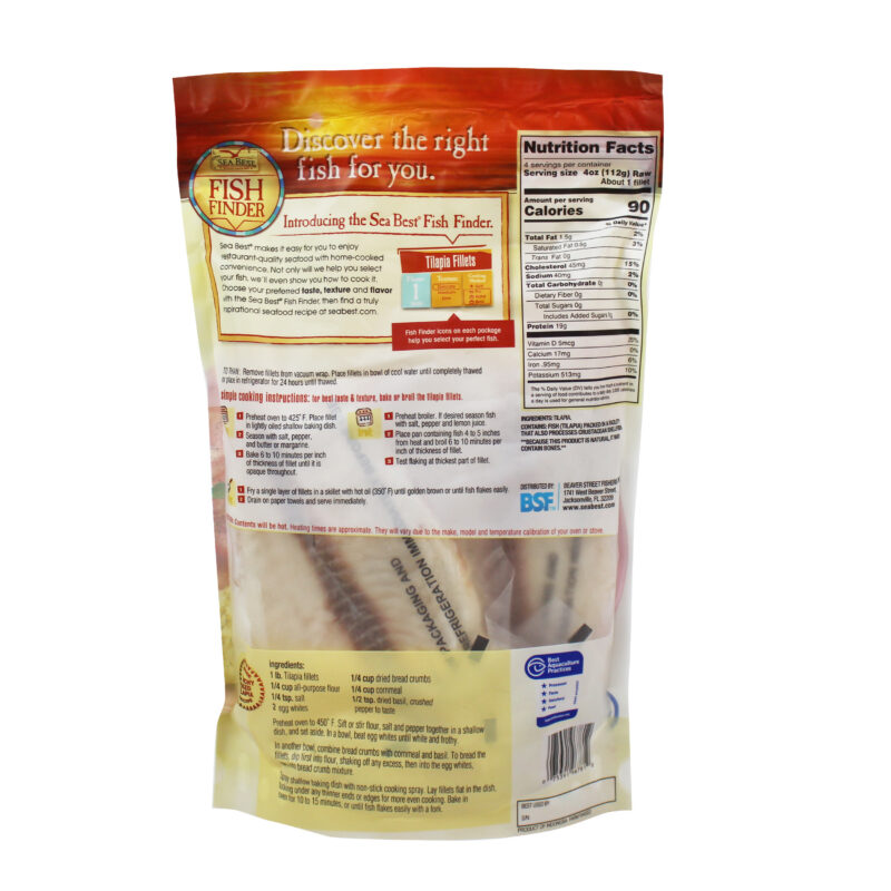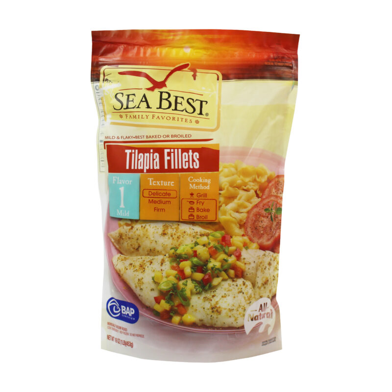 Sea Best Tilapia all natural fillets are farm-raised and processed in BAP Certified plants. Tilapia is a mild, lean fish that is popular for its palate-friendly flavor. The neutral taste of tilapia allows accompanying flavors to infuse the flaky meat, and it adapts to the seasoning and sauces it’s cooked in. Each Tilapia fillet is individually vacuum packed and packaged in a resealable bag for optimal freshness and convenience.